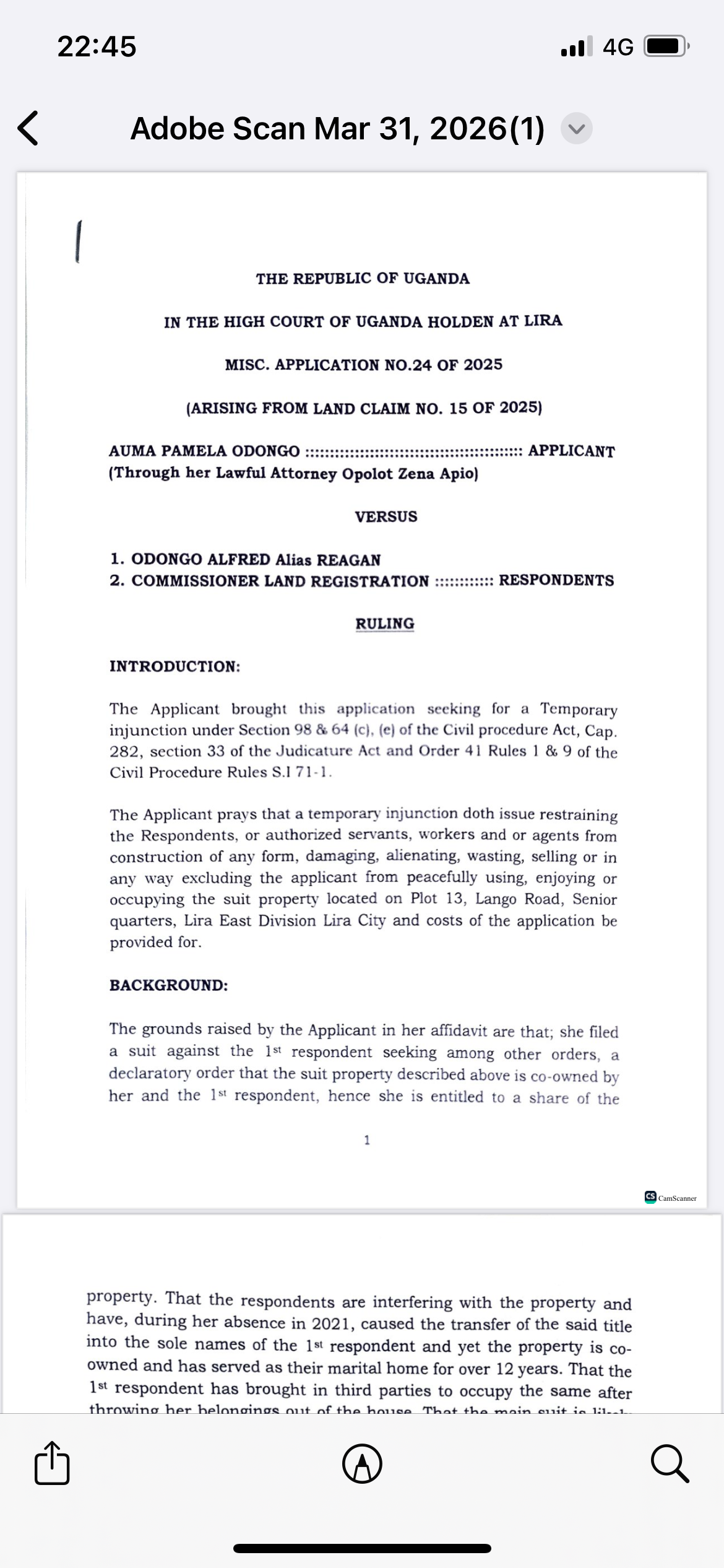 The applicant, Auma Pamela Odongo, acting through her lawful attorney Opolot Zena Apio, had sought a temporary injunction against Odongo Alfred Alias Reagan and the Commissioner Land Registration. The application sought to restrain the first respondent, his servants, or agents from constructing on, damaging, alienating, wasting, selling, or excluding the applicant from peacefully using and occupying the suit property located on Plot 13, Lango Road, Senior Quarters, Lira East Division, Lira City.