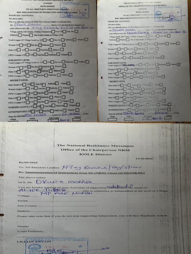 The crackdown extended beyond the executives. At least fifteen other NRM members from various villages were served with official warning letters for supporting candidates from other political parties. Names cited include Joy Atim Ongom (UPC flagbearer for Kole District Woman MP), Okello Macmoko, Olang Mark, Ocana Bonny, and others.