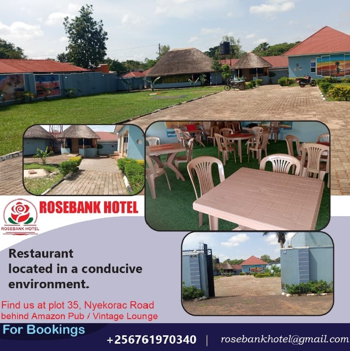 To check availability or tour the facility, visit Rosebank Hotel on Nyekorac Road, Plot 38 (behind Vintage Lounge), Lira City. For accommodation inquiries, the hotel is at Plot 35, Nyekorac Road (behind Amazon Pub / Vintage Lounge).