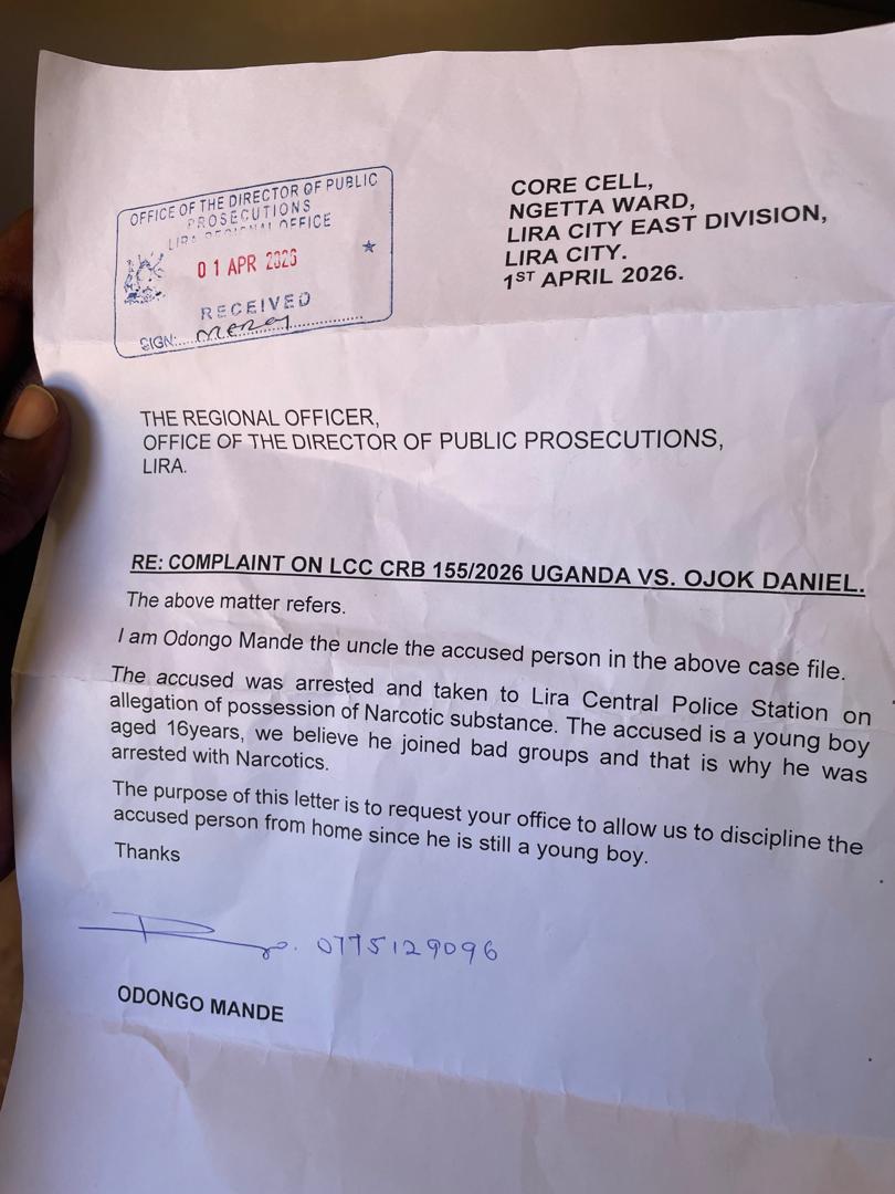 This admission directly contradicted an official letter he authored on April 1, 2026, addressed to the Regional Officer of the Office of the Director of Public Prosecutions (DPP) in Lira. In the letter, which was stamped as received by the DPP’s office, Odongo Mande introduced himself as “the uncle of the accused person” and claimed that Daniel Ojok is a minor aged 16. He requested the DPP to allow the family to “discipline the accused person from home.”